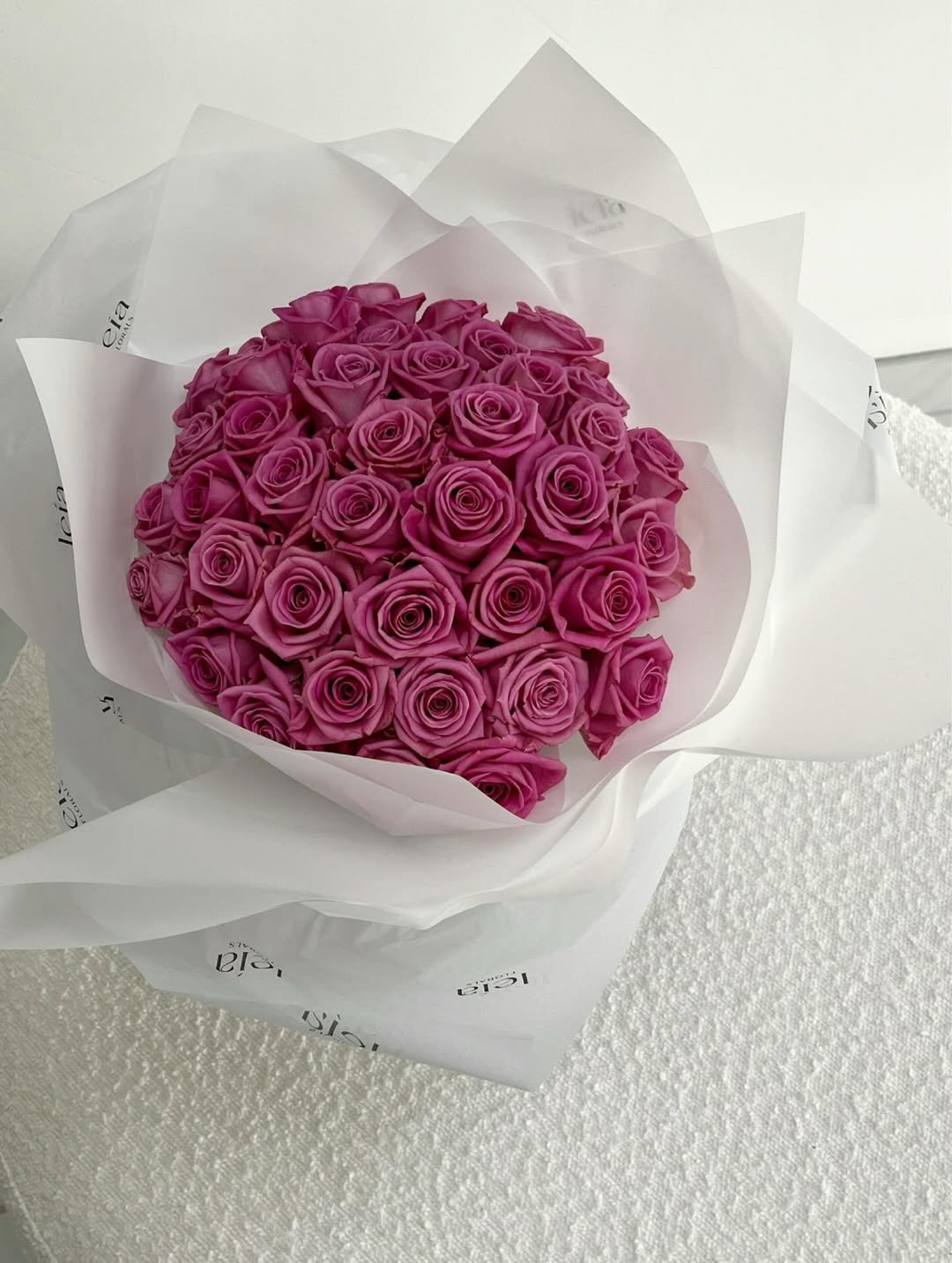 For those who want to make an undeniable and powerful statement, the “Magenta Muse” offers a bold departure from traditional soft pastels. We use only the finest, thick-petaled roses in a striking shade of deep magenta, arranged in a dense, uniform dome that showcases the sheer luxury of quantity and quality. The vibrant pink blooms pop dramatically against the minimalist white Leìa Florals signature wrapping, creating a high-contrast look that is modern and chic. This is a high-luxury product often chosen for Valentine’s Day, marriage proposals, or significant corporate celebrations where leaving a lasting, vibrant impression is the primary goal.